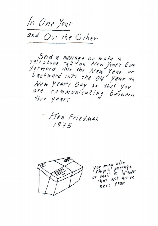 Friedman’s In One Year and Out the Other was first performed on New Year’s Eve in 1975, when Friedmann—based at that time in Springfield, Ohio—first phoned ahead to Dick Higgins, Nam June Paik, Peter Frank, Christo and Jeanne-Claude in New York, who were already in the year 1976. Then, after midnight, he called back from 1976 to Tom Garver, Natasha Nicholson, and Abraham Friedman in California.