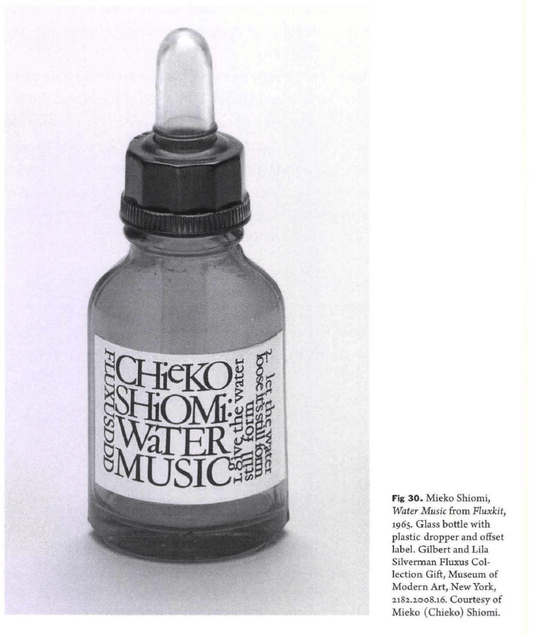 [14:00] Water Music (1964): ‘‘1. Give the water still form. 2. Let the water lose its still form.’’ For more information, see: Yoshimoto 2005, 152-154 and 159-160; Kawamura 2010, 313 – 314; also Friedman, Ken, Owen Smith and Lauren Sawchyn, eds. 2002. Fluxus Performance Workbook [n.p.] Performance Research, 2002 <https://www.thing.net/~grist/ld/fluxusworkbook.pdf> (accessed 18 September 2008)