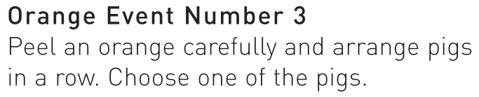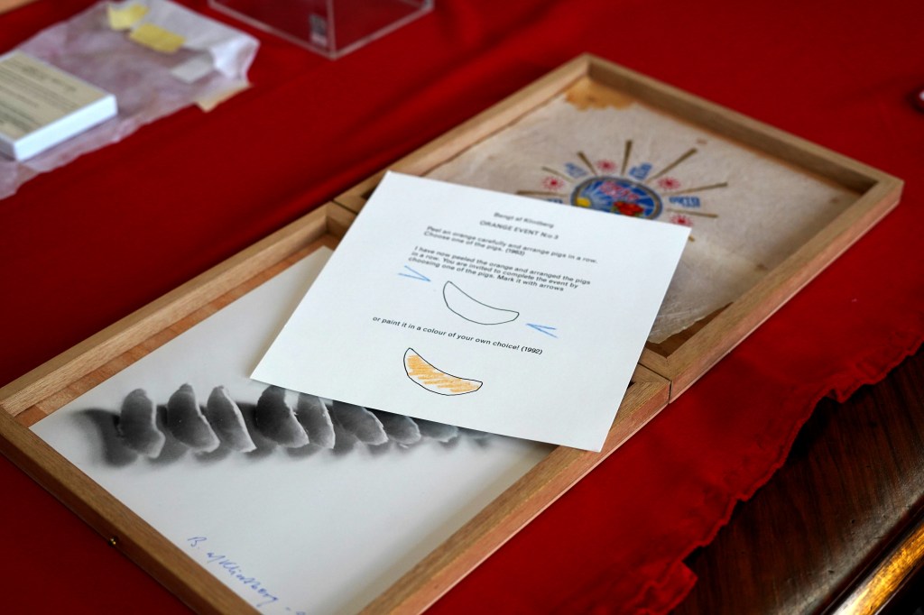 Around the same time, Edition Hundertmark published the Orange Event No 3 as a multiple– editioned wooden box containing the wrapping paper of an orange, a photograph of the orange slices arranged in a row (the same as in the editioned print) and a sheet of paper with the score and additional instructions. The box is meant to be interacted with, as the instructions, reiterating the original score, ask the user to choose one of the pigs by marking it with arrows or to paint it in a colour of one’s choice.