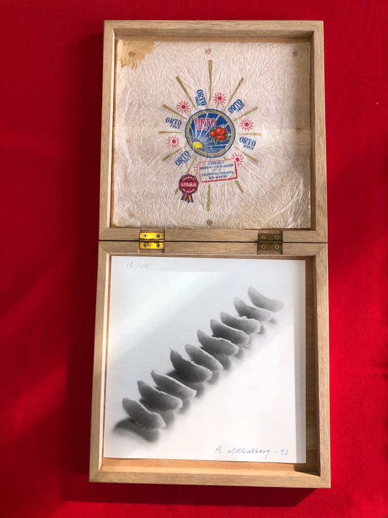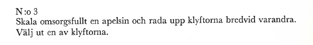 In 1992 af Klintberg produced a visual representation of the Orange Event No. 3 – an editioned black and white photograph of orange slices arranged in a line. It was produced for various exhibitions of Fluxus works that happened around this time. The version of the photograph collected by Moderna Museet is an editioned print on paper in which the photograph is accompanied by a typewritten title of the score and an explanation of the scored action. As the print does not offer a possibility for interacting with the photographed orange slices by choosing one of the “pigs”, af Klintberg added another instruction to the core of the original score in which he asks the recipient to perform the action of observing “the similarity between the units and the uniqueness of each of them”.