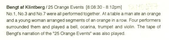 Ten years later, in 2016, Stockholm based Great Learning Orchestra performed all Twenty-Five Orange Events in Konstakademien simultaneously with another piece by af Klintberg titled Orangery Music (1963) and the recording of this unusual concert is available on SoundCloud.
