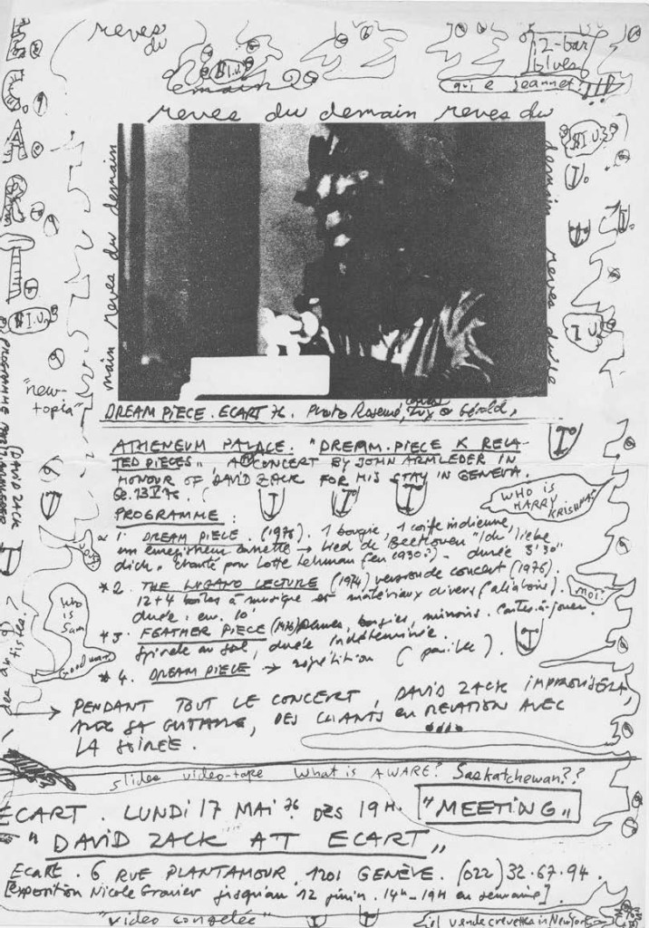 The inaugural presentation of Dream Piece took place within the context of a two-day event called “Capuut Mortum,” which was hosted at the Ecart Gallery in February 1976. This event featured a series of concerts that were conceptualized and performed by the Ecart Performance Group, an outgrowth of Ecart that was originally formed in conjunction with Ken Friedman’s exhibition in 1974. As a document published by Ecart in 1977 states, “[Ecart Performance Group] function is to assist artists who are presenting their actions, and to organize performances in which works by the group or its members no longer appear exclusively on the program”.[1] The Ecart Performance Group & Guest functioned as an overarching designation for collaborations involving diverse artists temporarily affiliated with the collective, who would come together to perform on various occasions. In addition to Armleder’s Dream Piece, “Caput mortuum” program encompassed works by the Ecart group’s other founding members, Patrick Rychner and Carlos Lucchini, alongside contributions from friends and associates such as Carlos Garcia, Gérald Minkoff, and Muriel Olesen.