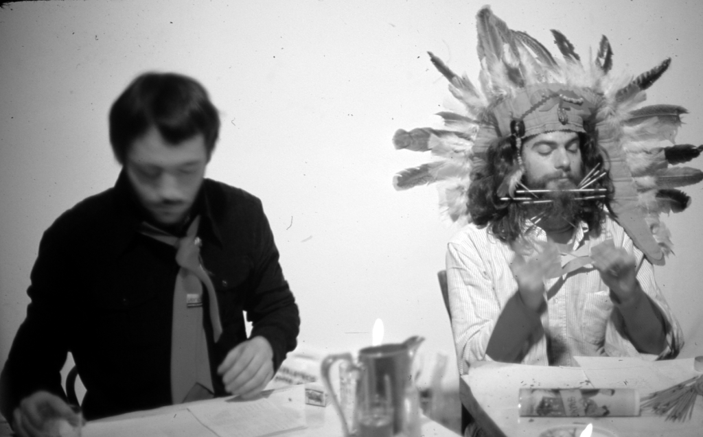 According to Armleder “the objects had been chosen at random. These were objects that belonged to me, which were simply there: the Indian headdress, the little toy, the candle, the music, for no apparent reason. They have no other link between them than the fact of having belonged to me and, like in most of our other performances, they were there, around us, and we had arranged them randomly, certainly by drawing lots.”[2]