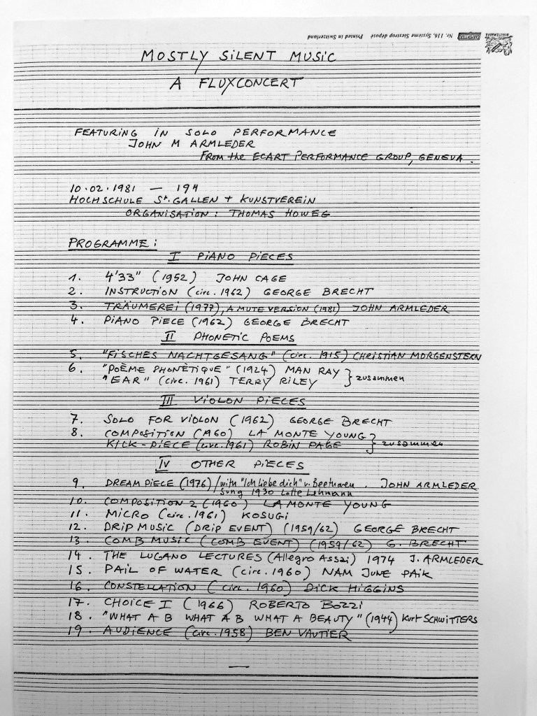 In February 1981, Dream Piece was performed once again, this time during the Fluxconcert organized by Ecart at the Hochschule and the Kunstverein in St. Gallen [3]. The event, titled “Mostly Silent Music,” showcased a collection of nineteen pieces categorized into four sections: piano pieces, phonetic poems, violin pieces, and other works. The concert featured a convergence of creations by notable figures such as George Brecht, La Monte Young, and Terry Riley. The opening piece was John Cage’s 4’33, setting the stage for a diverse range of performances. Dream Piece was presented within the “other pieces” segment. Its presentation within a Cagean tradition, alludes to a longstanding intellectual and artistic bond that John Armleder cultivated with the oeuvre of the American composer [4].