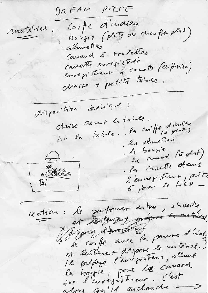 The handwritten instructions for the piece specifies that to perform it, one needs “an Indian headdress, a candle (tealight), matches, a duck on wheels, a cassette (on which a Beethoven Lied is recorded), a cassette player (for) playback, a chair, and a small table.” The audience is invited to stand in front of the table, on which all the elements are arranged. Then, “the performer enters, sits down, puts on the Indian headdress, prepares the player, lights the candle and places the duck on the player. Then he turns on the player. He listens to the lied while looking quite calm and contemplative at the duck. When the Lied is finished, he puts the duck away (flat), takes off the headdress, places it on the table, and extinguishes the candle. He gets up and leaves. The piece is finished.” The score ends with a series of technical instructions for the proper formal execution of the entire piece. No information is provided about the potential “content” of the work, as indicated by its title, namely, the dream to which it refers. [1]